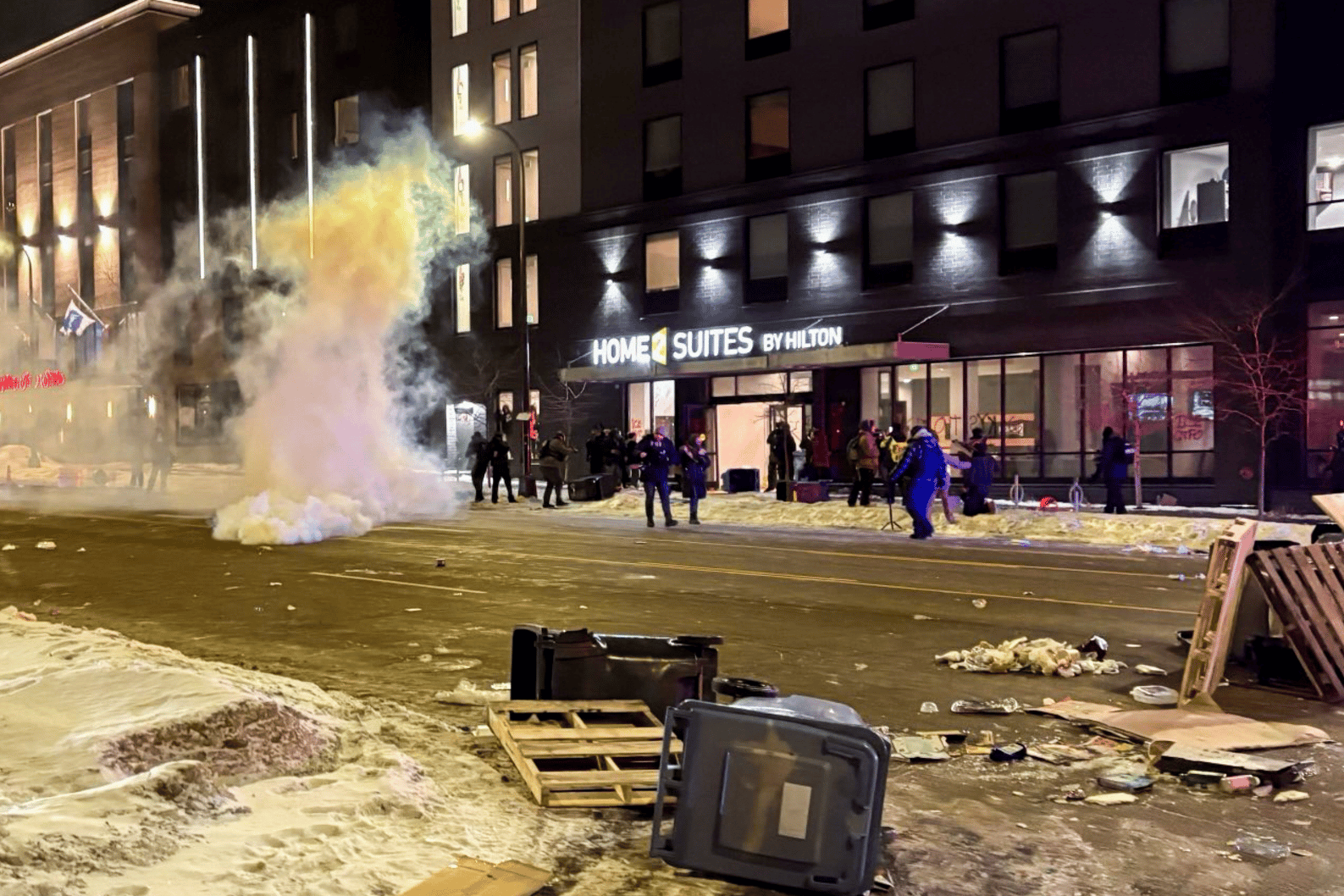 Tear gas lingers outside the Home2 Suites by Hilton on University Avenue SE, last night, Sunday, Jan. 25. | Photo by Ella Johnson, the Minnesota Daily